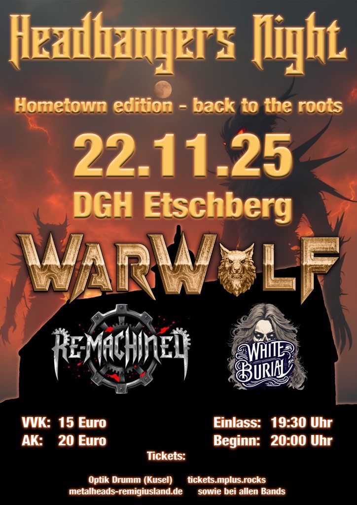 Nicht umsonst trägt Etschberg den Beinamen „Rock City“. In den 80ern und 90ern fanden dort legendäre Hallenkonzerte statt, die den Ort im gesamten Kreis Kusel bekannt machten. In Etschberg gründeten sich 2004 die Metalheads Remigiusland, um den Metal in der damals Konzert toten Westpfalz am Leben zu erhalten. Dass dies gelungen ist, dürfte heute bei dem vielfältigen Angebot an Konzerten und Festivals außer Frage stehen. Aus verschiedenen Gründen war es ab 2005 leider nicht möglich in unserem Heimatort die Headbangers Night zu veranstalten und mit der Zeit sind wir dann in Konken heimisch geworden. Ein Traum der Metalheads Remigiusland war es aber schon immer, eine HBN in Etschberg zu veranstalten. Am 22.11.2025 wird es nun endlich soweit sein.